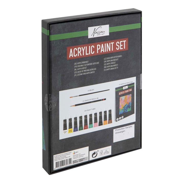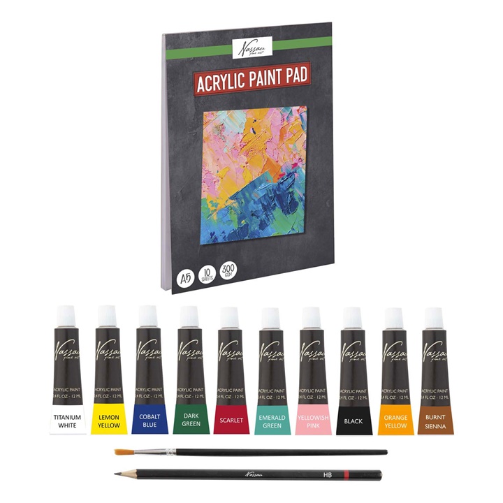 Sada akrylových farieb Nassau s blokom na maľovanie je kompletný set pre kreatívne tvorenie akrylom je ideálnym riešením pre začiatočníkov aj skúsených umelcov, ktorí chcú objavovať možnosti akrylového maľovania. Tento kompletný set obsahuje 10 vysokokvalitných akrylových farieb v 12 ml tubách, štetec, grafitovú ceruzku HB a špeciálny blok na akrylové farby, ktorý poskytuje optimálny povrch na nanášanie farieb. Akrylové farby sú rýchloschnúce, sýto pigmentované a ľahko miešateľné, čo umožňuje vytvárať bohaté textúry a efekty. Táto sada je skvelá na maľovanie na plátno, papier, drevo alebo iné povrchy a ponúka široké možnosti pre tvorbu abstraktných i realistických diel. Či už ste študent umenia, hobby maliar alebo profesionálny umelec, tento kompletný akrylový set vám poskytne všetko potrebné na experimentovanie a rozvoj vášho kreatívneho talentu.