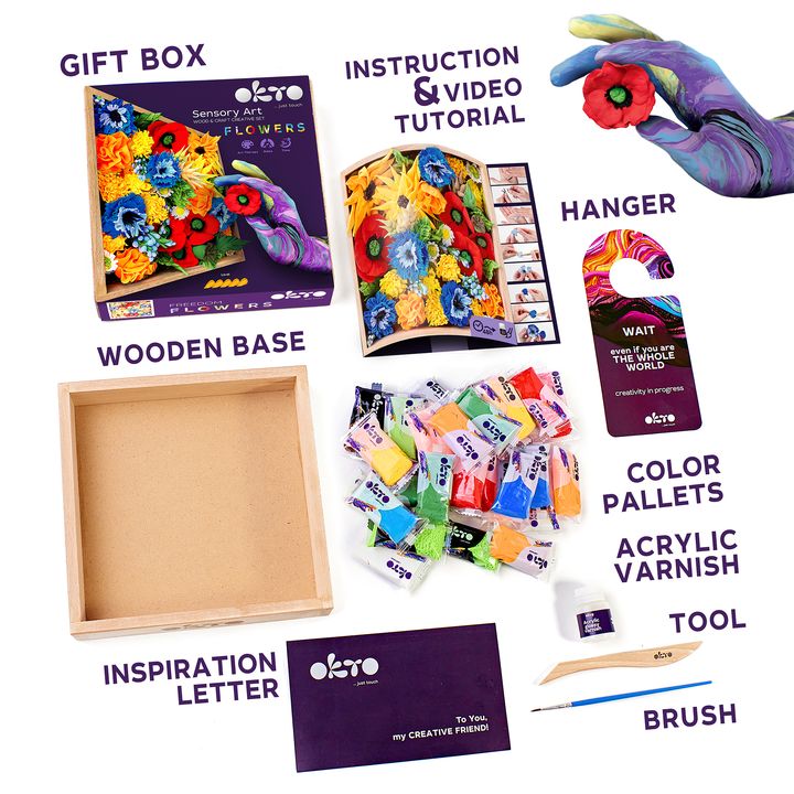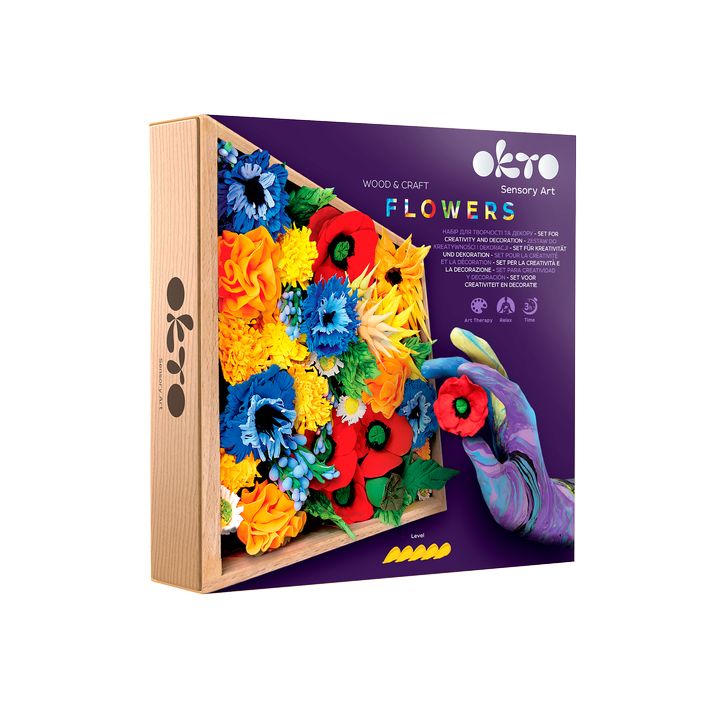 Τοσετ μοντελοποίησης OKTO σε ξύλινο πλαίσιο Sensory Art - Λουλούδια έχει σχεδιαστεί για ενήλικες που αναζητούν ένα πρωτότυπο δώρο ή μια ευχάριστη δραστηριότητα αναψυχής. Το σετ προσφέρει μια χαλαρωτική διαδικασία μοντελοποίησης λουλουδιών κατά την οποία μπορείτε να δημιουργήσετε μια μοναδική εσωτερική σύνθεση. Στη συσκευασία θα βρείτε όλα όσα χρειάζεστε για τη δημιουργία μοντελοποιημένων λουλουδιών: ξύλινη βάση-πλαίσιο, οδηγίες χρήσης, ξύλινο εργαλείο μοντελοποίησης, αυτοσκληρυνόμενη μάζα, ακρυλικό βερνίκι και πινέλο. Ο αεροπλαστικός πηλός χάνει εν μέρει τις ιδιότητές του μετά από 10 λεπτά στον αέρα, γι' αυτό συνιστάται να μην αφήνετε τις συσκευασίες με τον πηλό ανοιχτό. Συνιστούμε το στέγνωμα της τελικής σύνθεσης για 48 ώρες, μετά το οποίο μπορείτε να την καλύψετε με προστατευτικό βερνίκι ανάλογα με την επιθυμία σας. Ένα γυαλιστερό ή ματ ακρυλικό βερνίκι νερού είναι κατάλληλο. Η αυτοσκληρυνόμενη μάζα είναι ασφαλής για την υγεία και μη τοξική, δεν προκαλεί αλλεργίες. Παρακαλούμε διαβάστε προσεκτικά τις οδηγίες χρήσης πριν από τη χρήση. Αυτό το σετ μοντελοποίησης δεν είναι παιχνίδι και προορίζεται μόνο για ενήλικες. Είναι ιδανικό για τη διακόσμηση εσωτερικών χώρων ή ως δημιουργική θεραπεία, προσφέροντας όχι μόνο αισθητική απόλαυση αλλά και μια ευκαιρία για την ανάπτυξη των χειρωνακτικών δεξιοτήτων και της δημιουργικής έκφρασης.