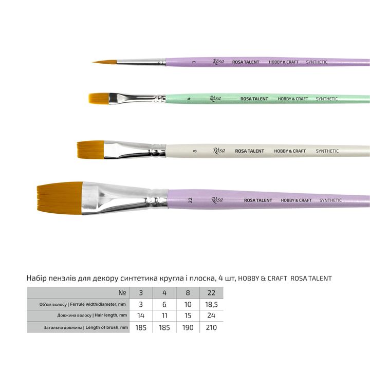 Το σετ συνθετικών πινέλων ROSA TALENT για διακόσμηση - στρογγυλό και επίπεδο σχήμα είναι η ιδανική επιλογή για όλους τους δημιουργούς και τους καλλιτέχνες που ασχολούνται με το χόμπι. Περιέχει πινέλα διαφόρων μεγεθών (3, 4, 8, 22), τα οποία επιτρέπουν λεπτομερή εργασία καθώς και επίπεδη εφαρμογή χρώματος, βερνικιού ή κόλλας. Οι συνθετικές ίνες είναι μαλακές, ελαστικές και ανθεκτικές στους διαλύτες, εξασφαλίζοντας τη μακροζωία τους και την ομοιόμορφη κάλυψη χωρίς ραβδώσεις. Τα πινέλα είναι κατάλληλα για διάφορες τεχνικές, όπως ντεκουπάζ, διακοσμητική ζωγραφική και ζωγραφική υφασμάτων. Η άνετη κοντή λαβή επιτρέπει τον ακριβή χειρισμό κατά τη διάρκεια της δημιουργίας. Χάρη στην ποιοτική κατασκευή, οι τρίχες δεν πέφτουν ακόμα και με μακροχρόνια χρήση. Αυτό το σετ είναι κατάλληλο για αρχάριους και έμπειρους καλλιτέχνες που αναζητούν αξιόπιστα πινέλα για τη δημιουργία χόμπι
