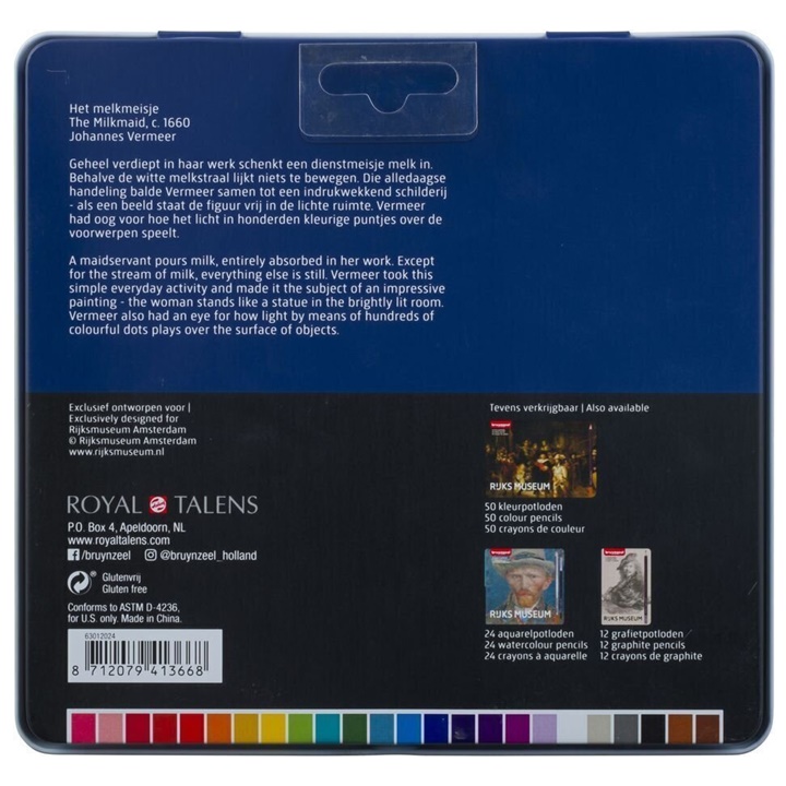 Σετ ξυλομπογιών εμπνευσμένο από τη ζωγραφική του Vermeer οπόυ μια υπηρέτρια χύνει γάλα. Δοκιμάστε να βάψετε αυτήν την εικόνα ή να δημιουργήσετε κάτι εντελώς νέο. Παίξτε ως Vermeer και παίξτε με χρώματα όπως αυτός. Οι 24 ξυλομπογιές σε αυτό το σετ είναι κατασκευασμένα για ζωγραφική και ζωγραφική τέχνης.