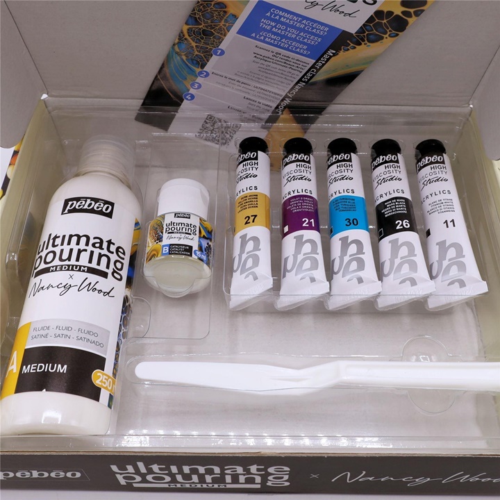 Το Pebeo Ultimate Pouring Medium Set είναι ένα μοναδικό μέσο έκχυσης 2 τεμαχίων που σχεδιάστηκε από την καλλιτέχνη Nancy Wood σε συνεργασία με την Pebeo. Αποτελείται από ένα ακρυλικό μέσο χύτευσης και έναν καταλύτη που αντιδρούν φυσικά για να παράγουν ελεγχόμενα και αξιόπιστα αποτελέσματα με όσο το δυνατόν λιγότερα απόβλητα. Είναι πιο εύκολο στο χειρισμό από άλλα ακρυλικά μέσα χύτευσης. Χρησιμοποιώντας έναν καταλύτη, δημιουργείτε κύτταρα και ένα εφέ δαντέλας σε χυμένο ακρυλικό χρώμα. Είναι εύκολο στη χρήση, με βάση το νερό και επιτρέπει σε καλλιτέχνες και αρχάριους να κατακτήσουν την ακρυλική τεχνική της έκχυσης υγρού με ελεγχόμενο τρόπο για να επιτύχουν εξαιρετικά αποτελέσματα. Αυτό είναι ένα ιδανικό πρώτο σετ για αρχάριους που θέλουν να πειραματιστούν με την τεχνική της έκχυσης.