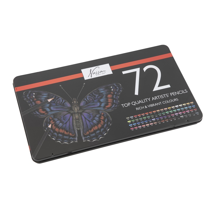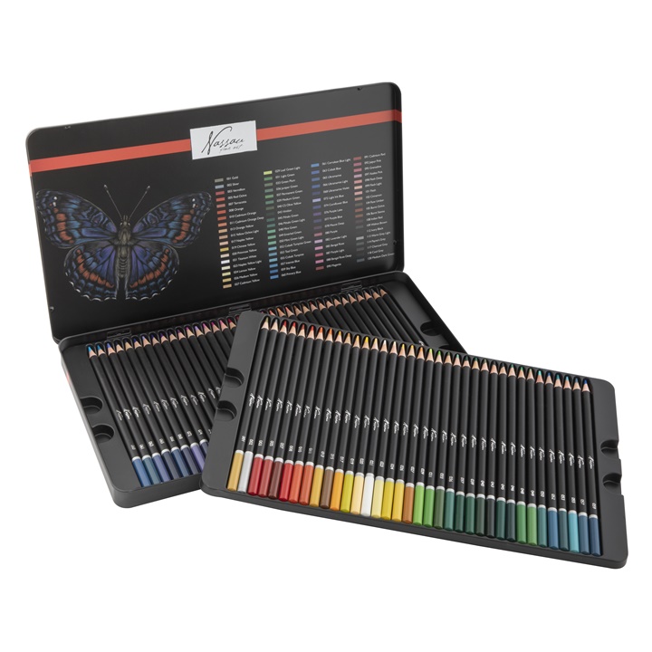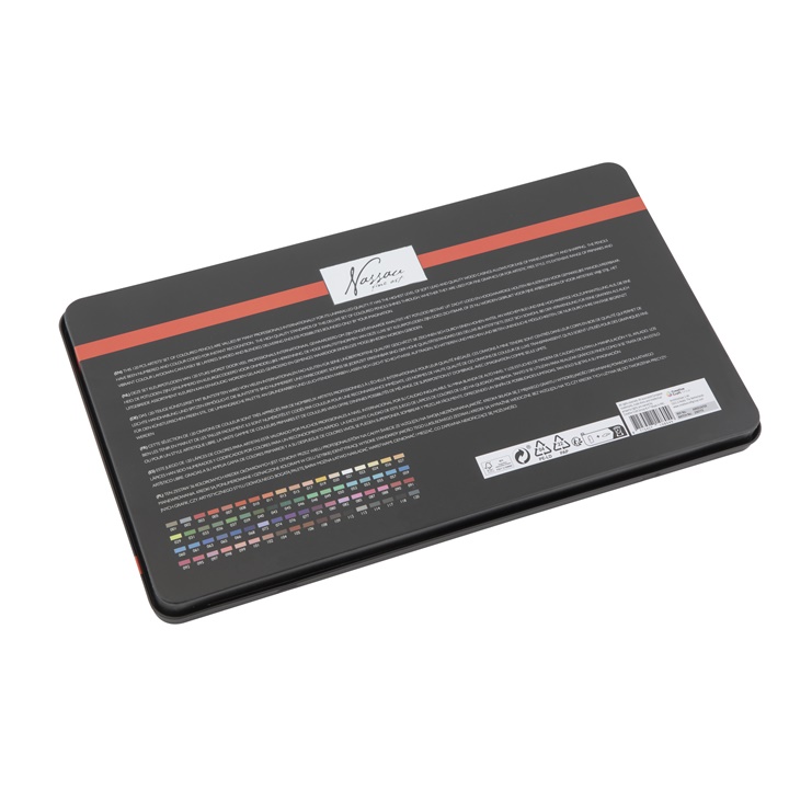 ΗNassau Fine Art παρουσιάζει με υπερηφάνεια ένα σετ από 72 χρωματιστά μολύβια σε τσίγκινο κουτί, τοποθετημένα σε δύο σειρές και αριθμημένα ανά απόχρωση. Αυτό το σετ είναι ένα από τα πρώτα που φιλοξενεί τα κορυφαία χρωματιστά μολύβια της Nassau Fine Art για τους επίδοξους και τους επαγγελματίες καλλιτέχνες. Τα μολύβια έχουν μαλακή ξύλινη λαβή. Κάθε μολύβι έχει μαύρη κάννη και είναι χρωματισμένο με μελάνι γραφής και σφραγισμένο με έναν αριθμό χρώματος στην άκρη. Το μεταλλικό κουτί εμφανίζει τις αποχρώσεις των χρωμάτων στο εσωτερικό του για εύκολη αναγνώριση και για να σας βοηθήσει να δημιουργήσετε μοναδικά σχέδια. Το κουτί είναι ειδικά σχεδιασμένο για τη φύλαξη των κραγιόν της Nassau Fine Art. Αυτά τα επίπεδα είναι κατασκευασμένα από πλαστικό. Κάντε δώρο στους αγαπημένους σας με αυτό το μοναδικό σετ κραγιόν.